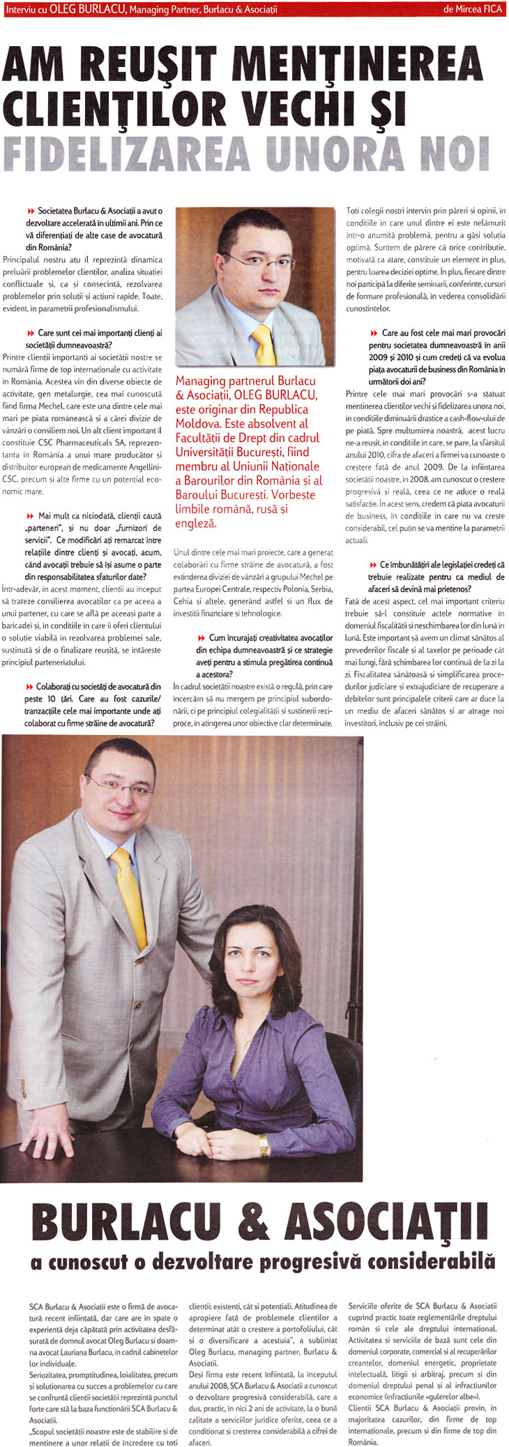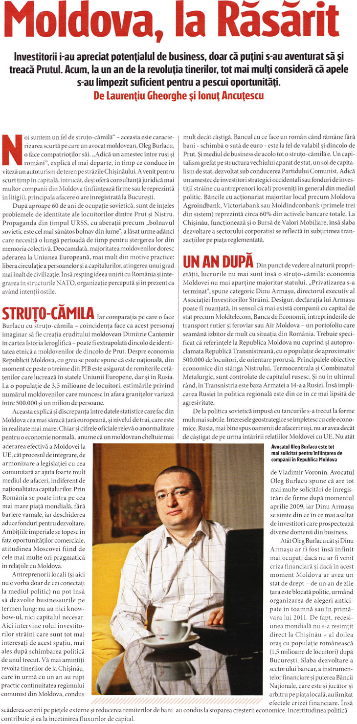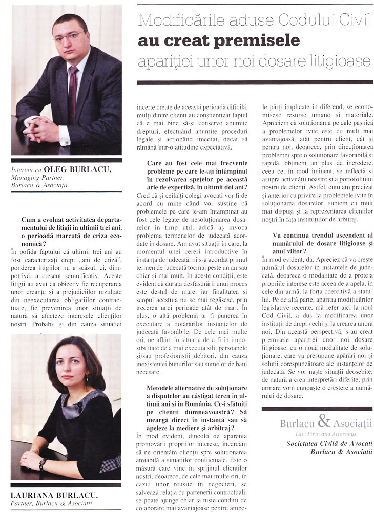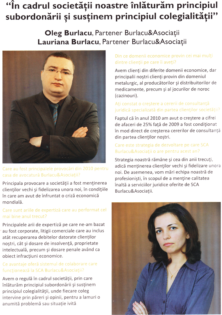 “Dar pentru casele de avocatură mai mici, precum a noastră, de la momentul declanşării crizei am consemnat creşterea considerabilă a numărului de clienţi”, explică Burlacu faptul că serviciile firmelor mai mici de avocatură au început să fie din ce în ce mai solicitate de companii.